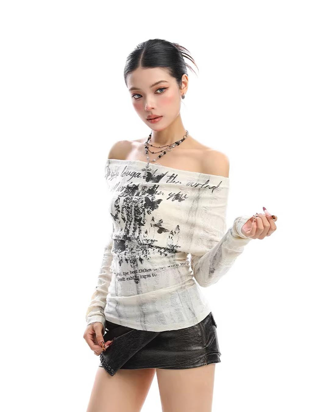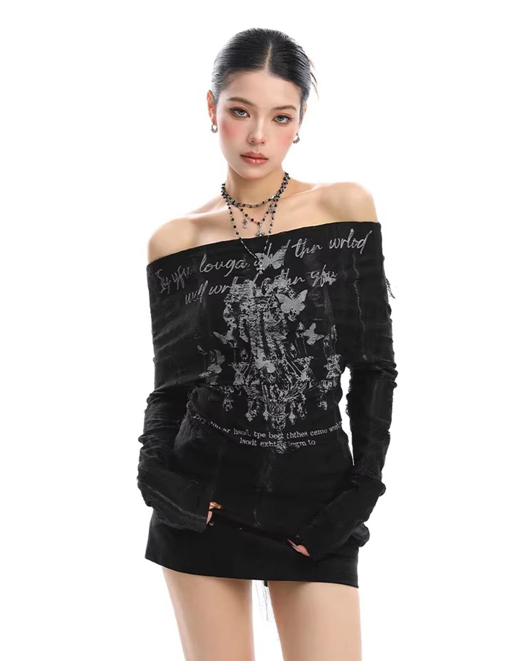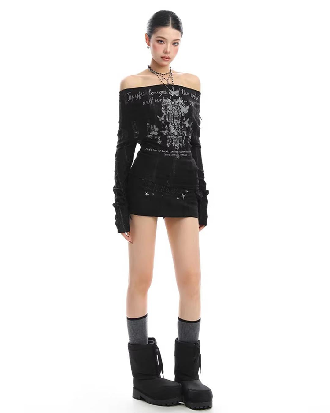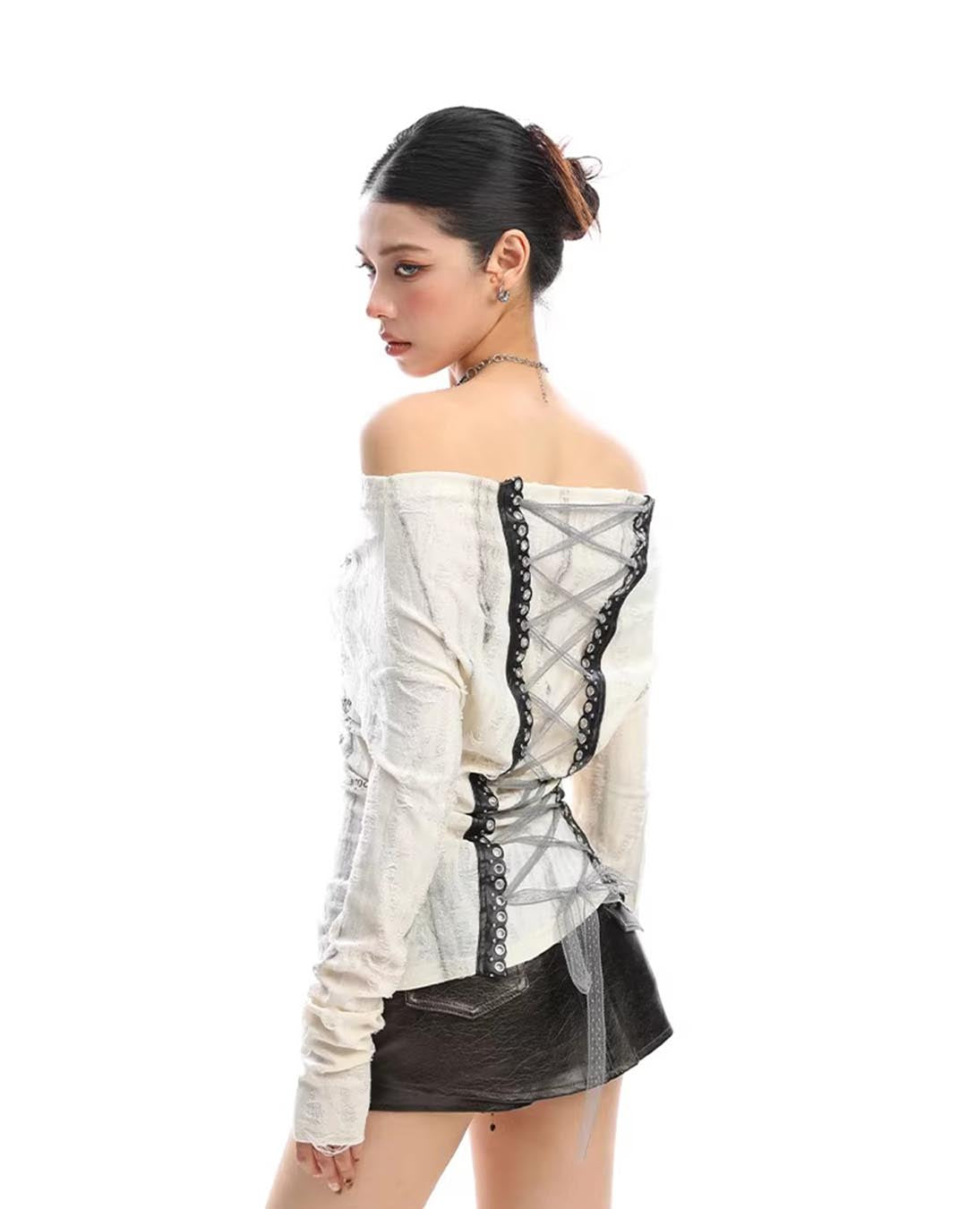 GRAFFITI OFF-SHOULDER LACE-BACK LONG SLEEVE TOP - BLACK
