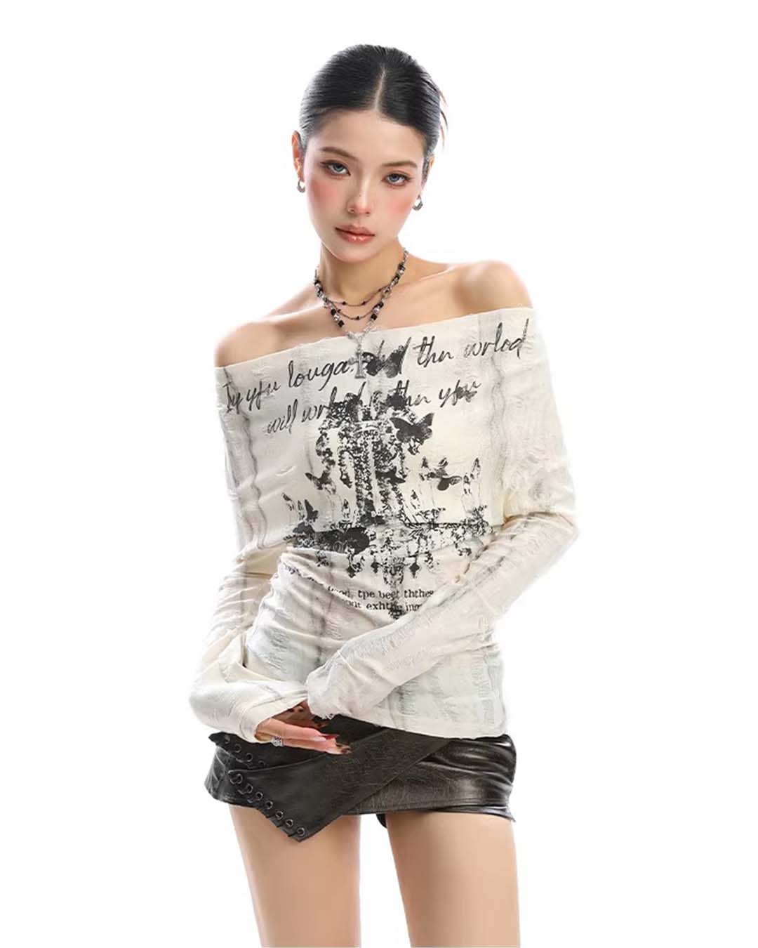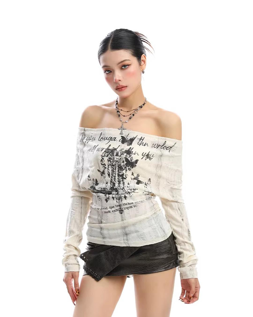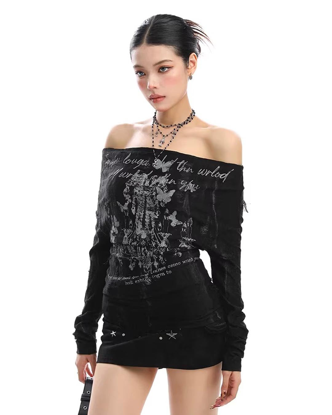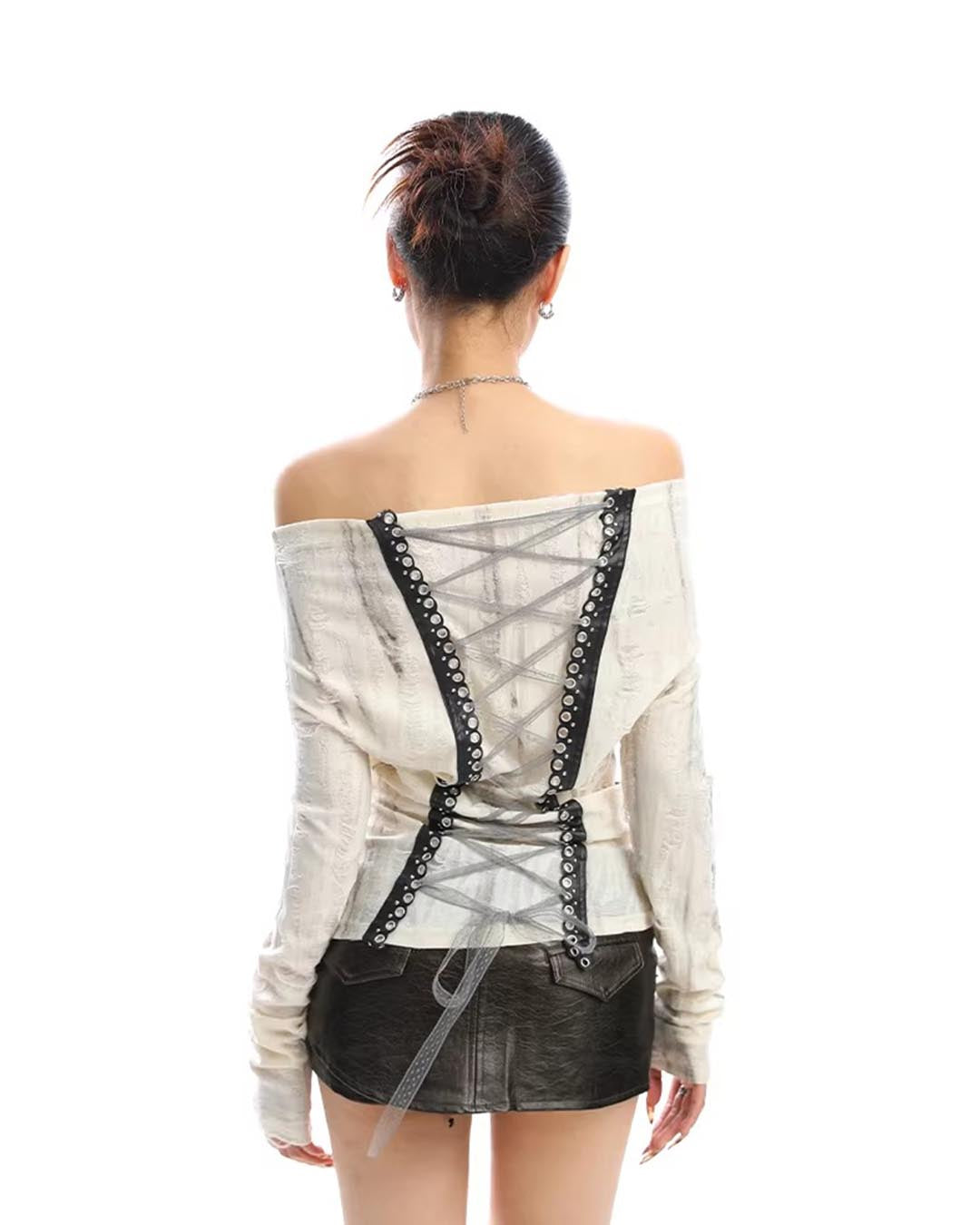 GRAFFITI OFF-SHOULDER LACE-BACK LONG SLEEVE TOP - BLACK