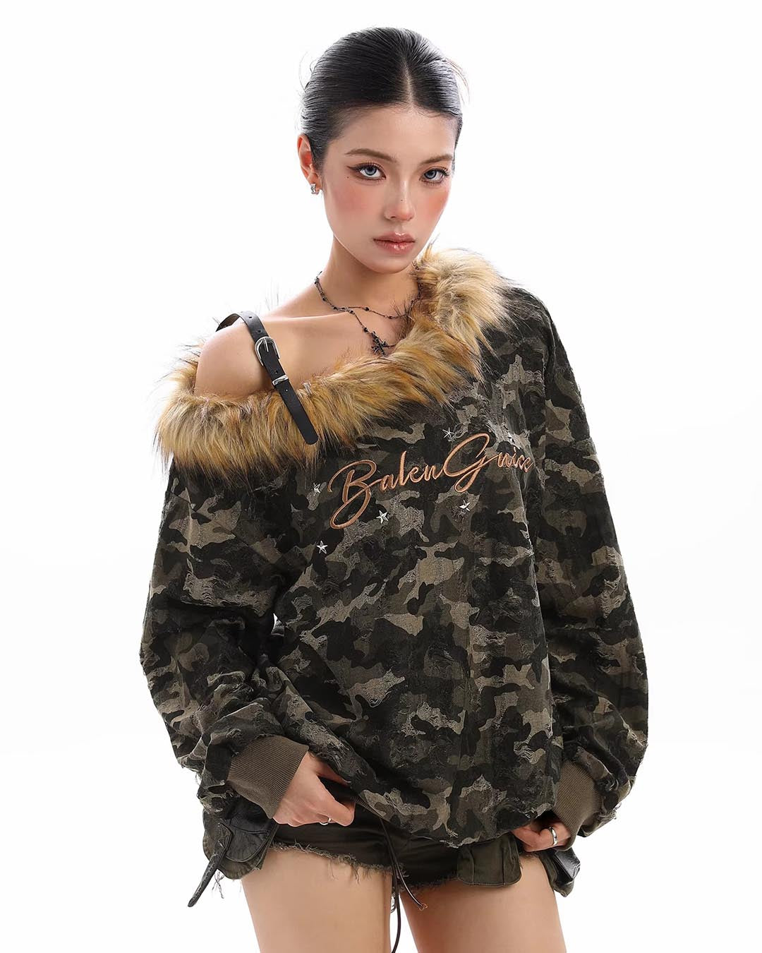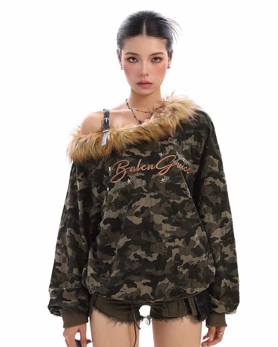 CAMOUFLAGE ONE-SHOULDER FUR COLLAR SWEATSHIRT - CAMOUFLAGE