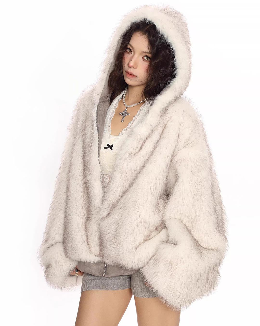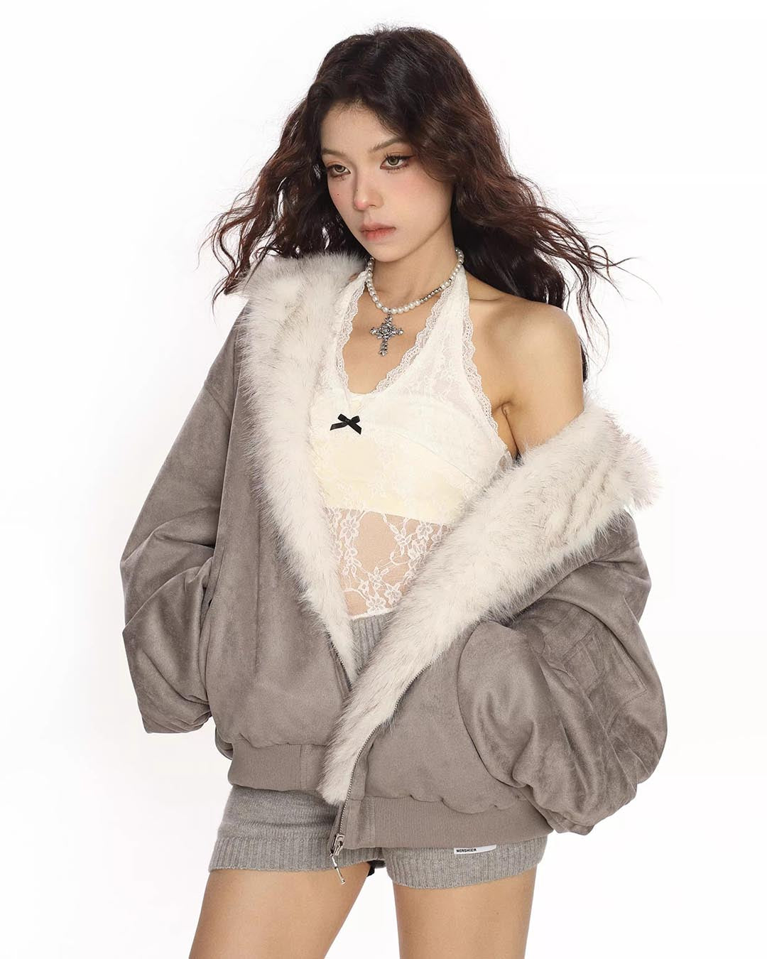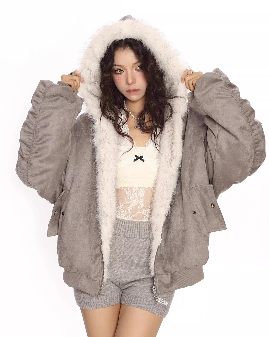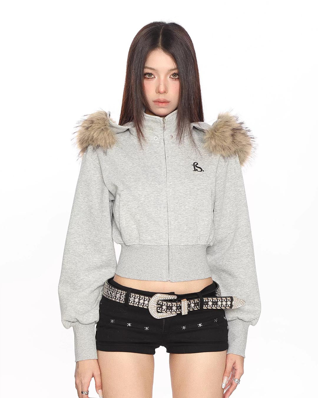 FUR COLLAR CROPPED HOODIE - HEATHER GREY