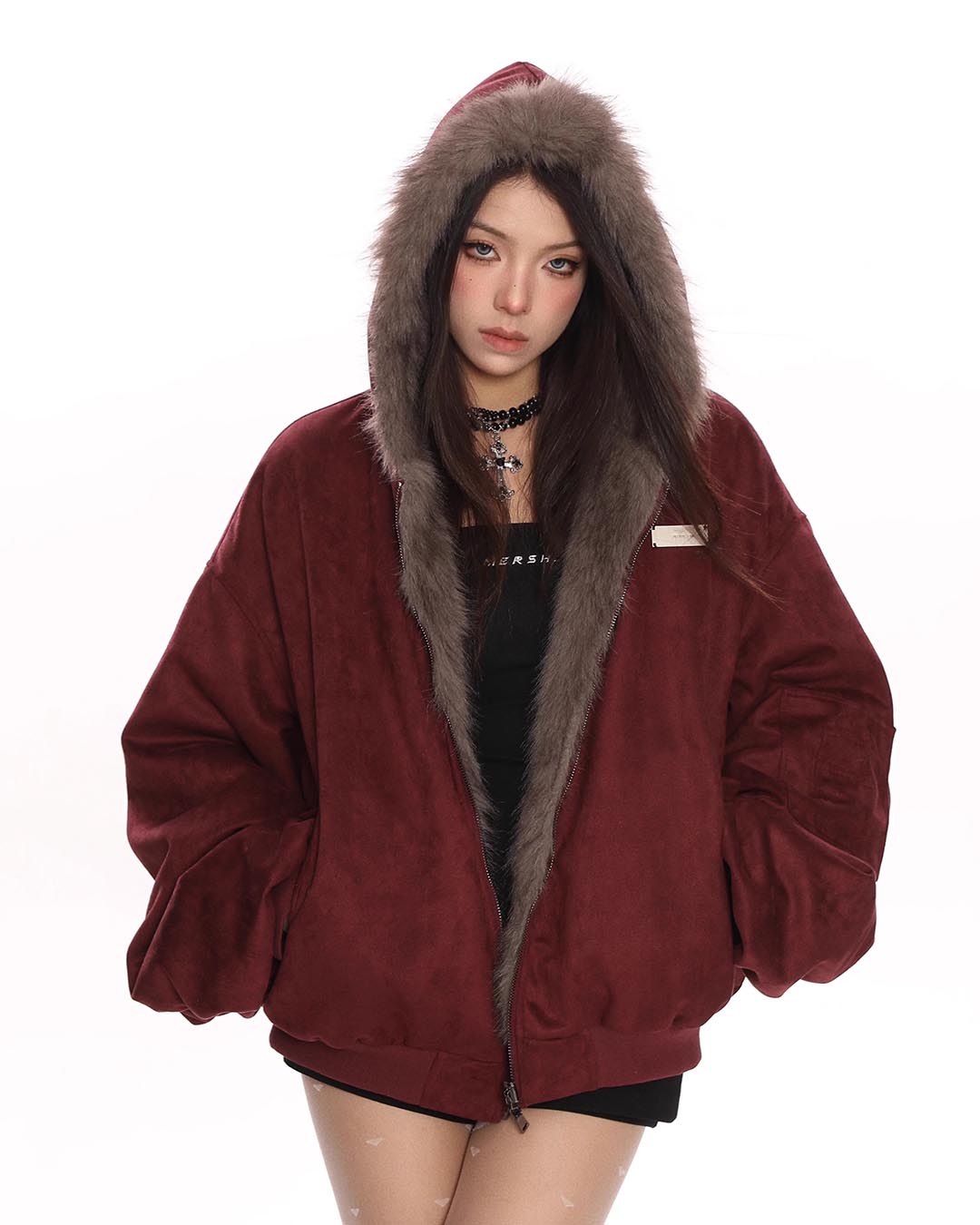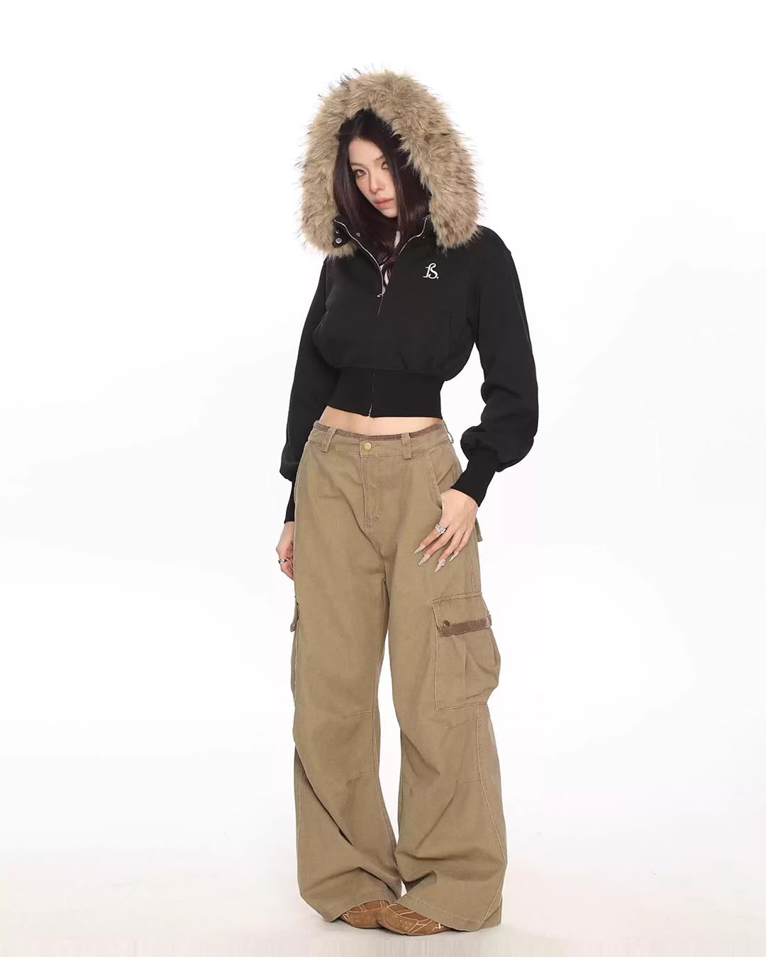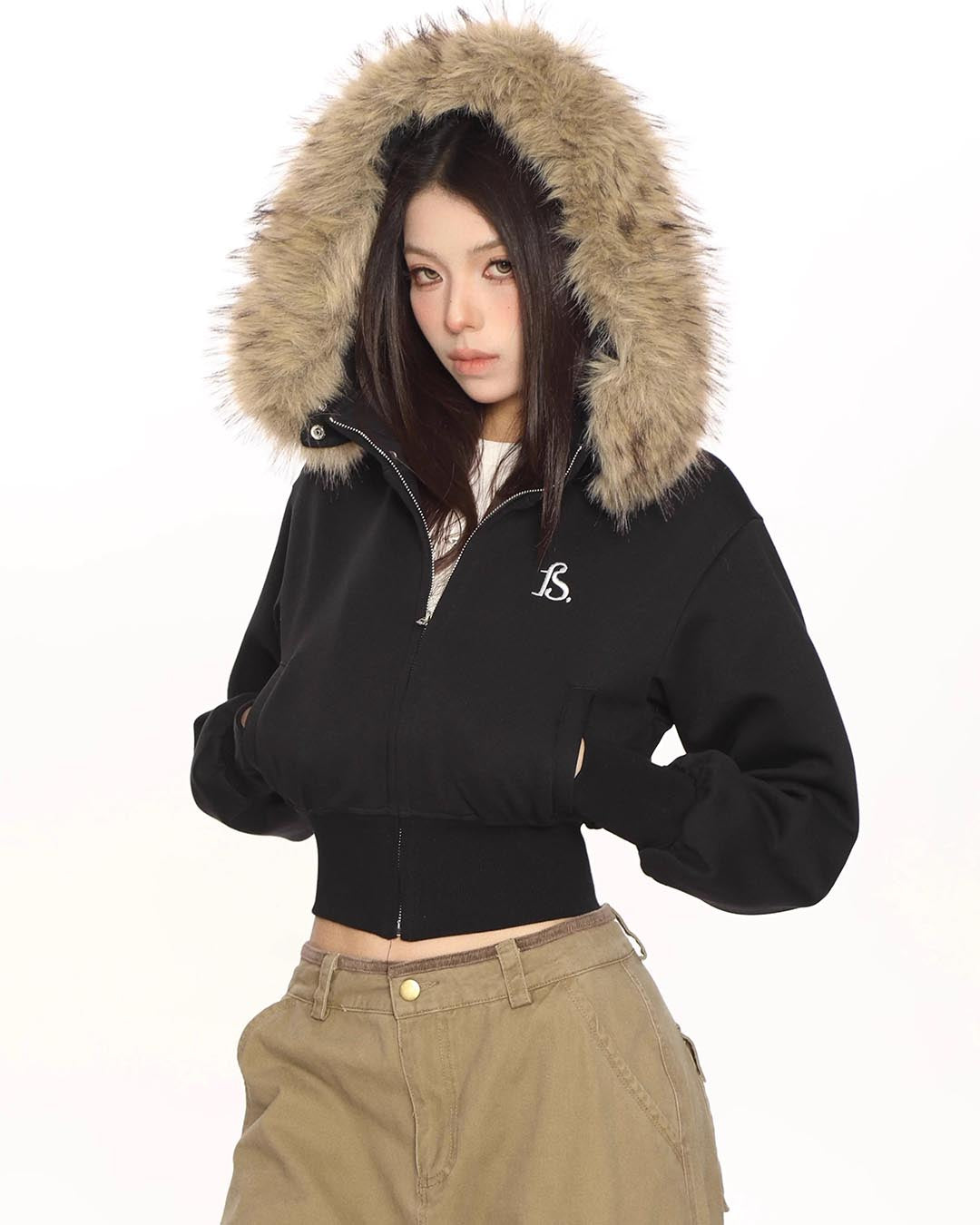 FUR COLLAR CROPPED HOODIE - BLACK