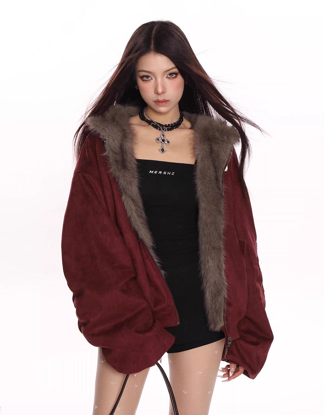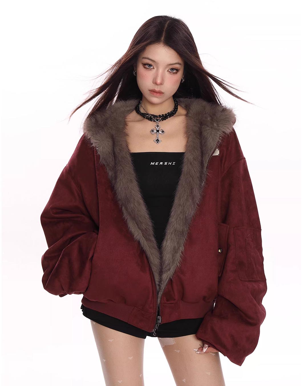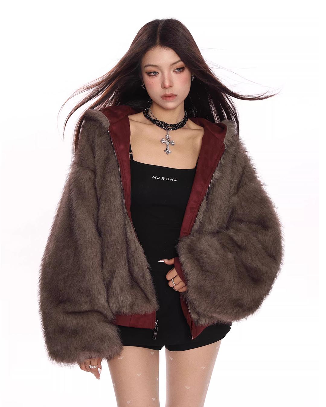 FUR COLLAR CROPPED HOODIE - BLACK
