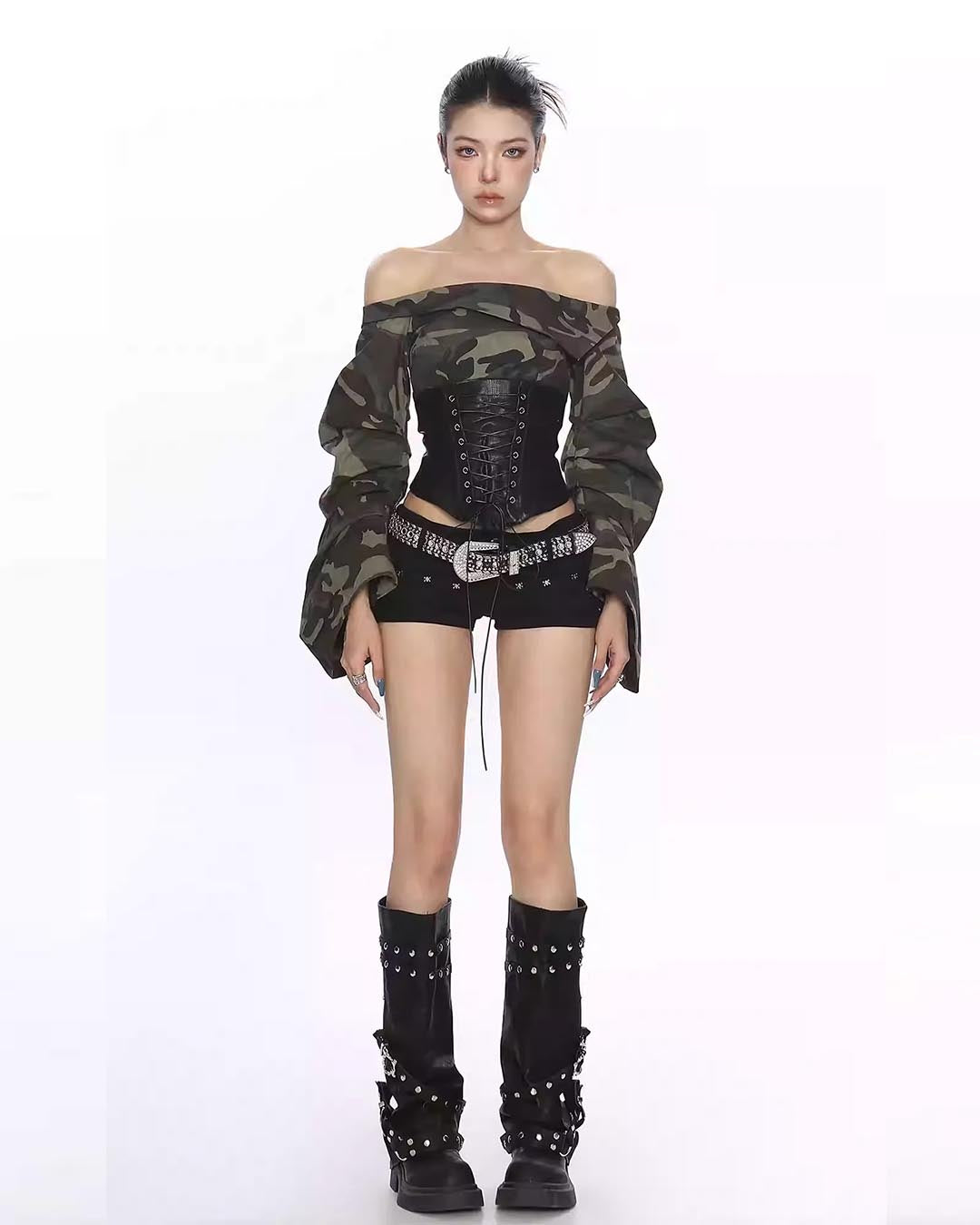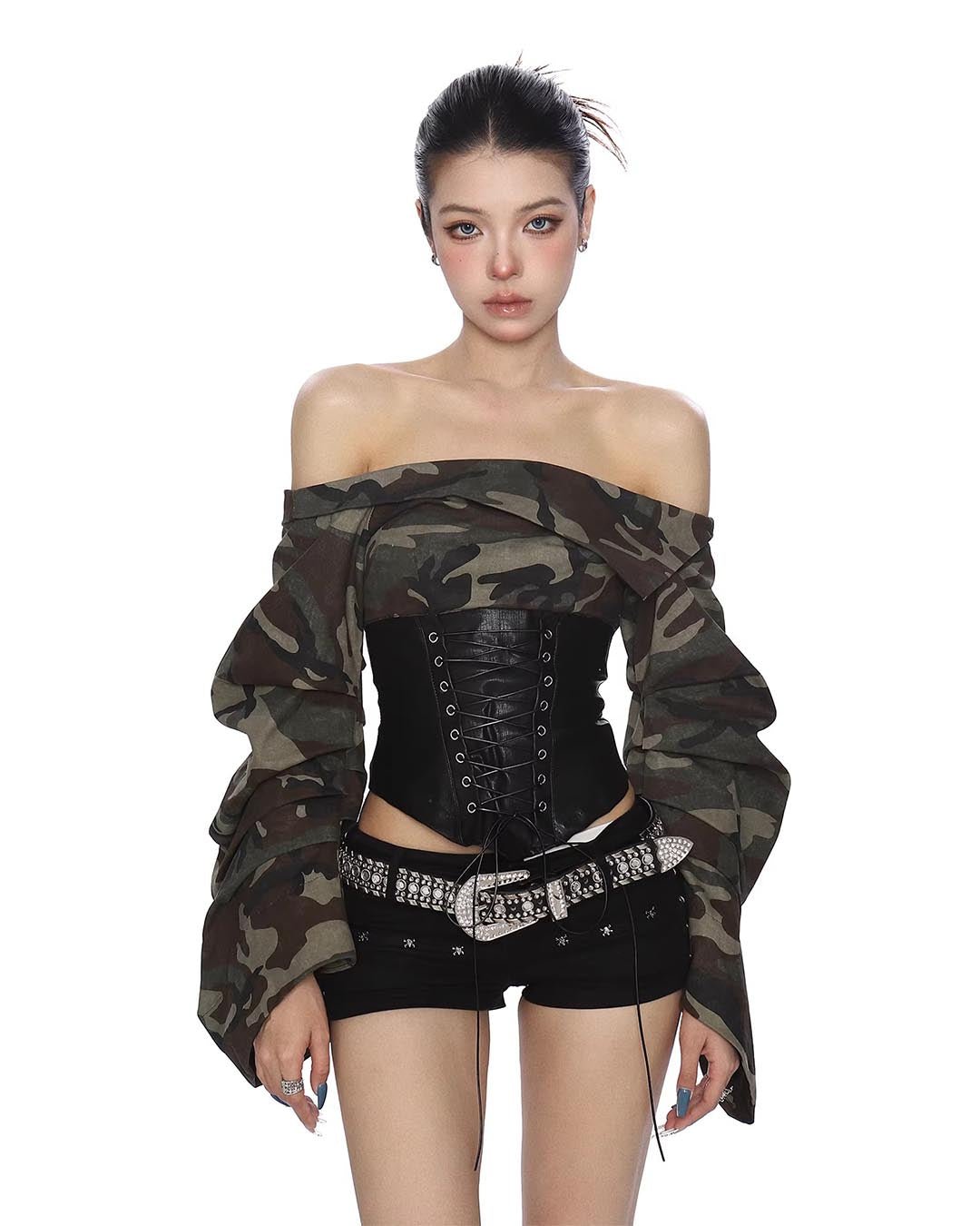 CAMOUFLAGE LACE-TIE WAIST OFF-SHOULDER LONG SLEEVE TOP - CAMOUFLAGE
