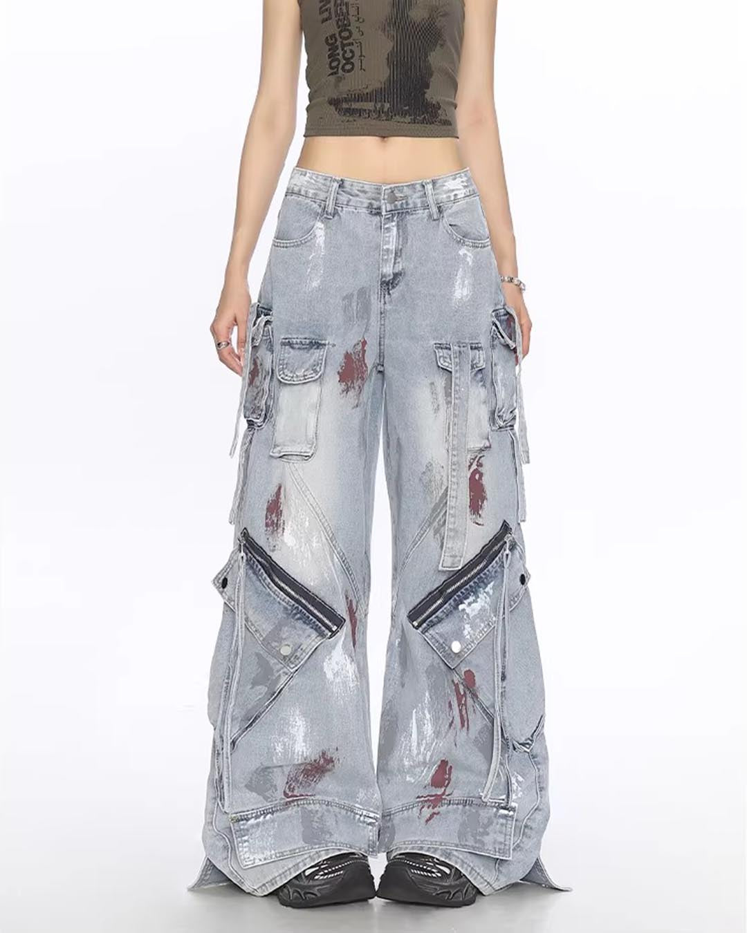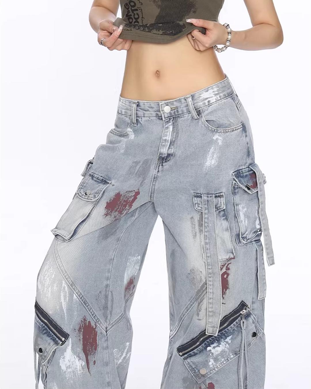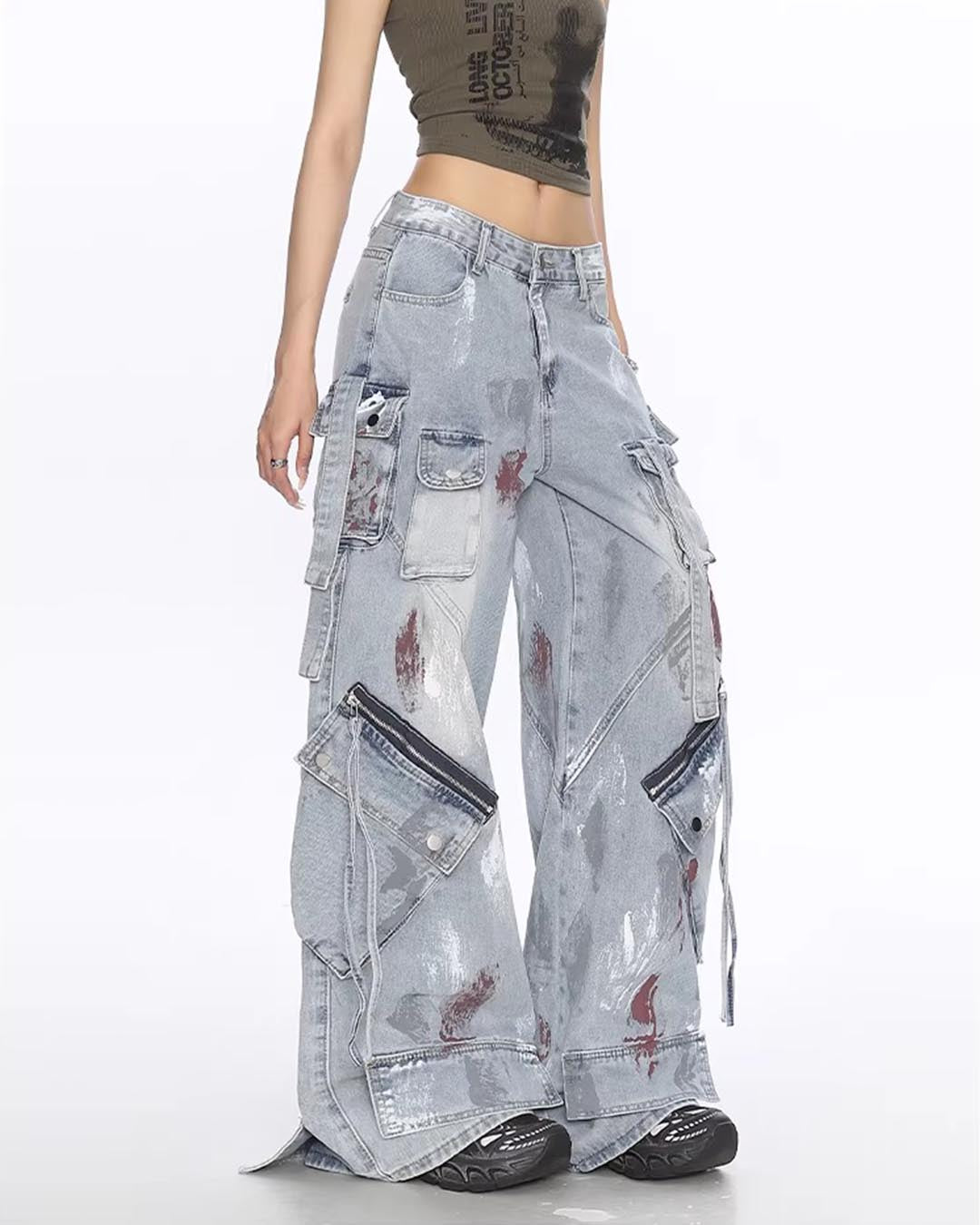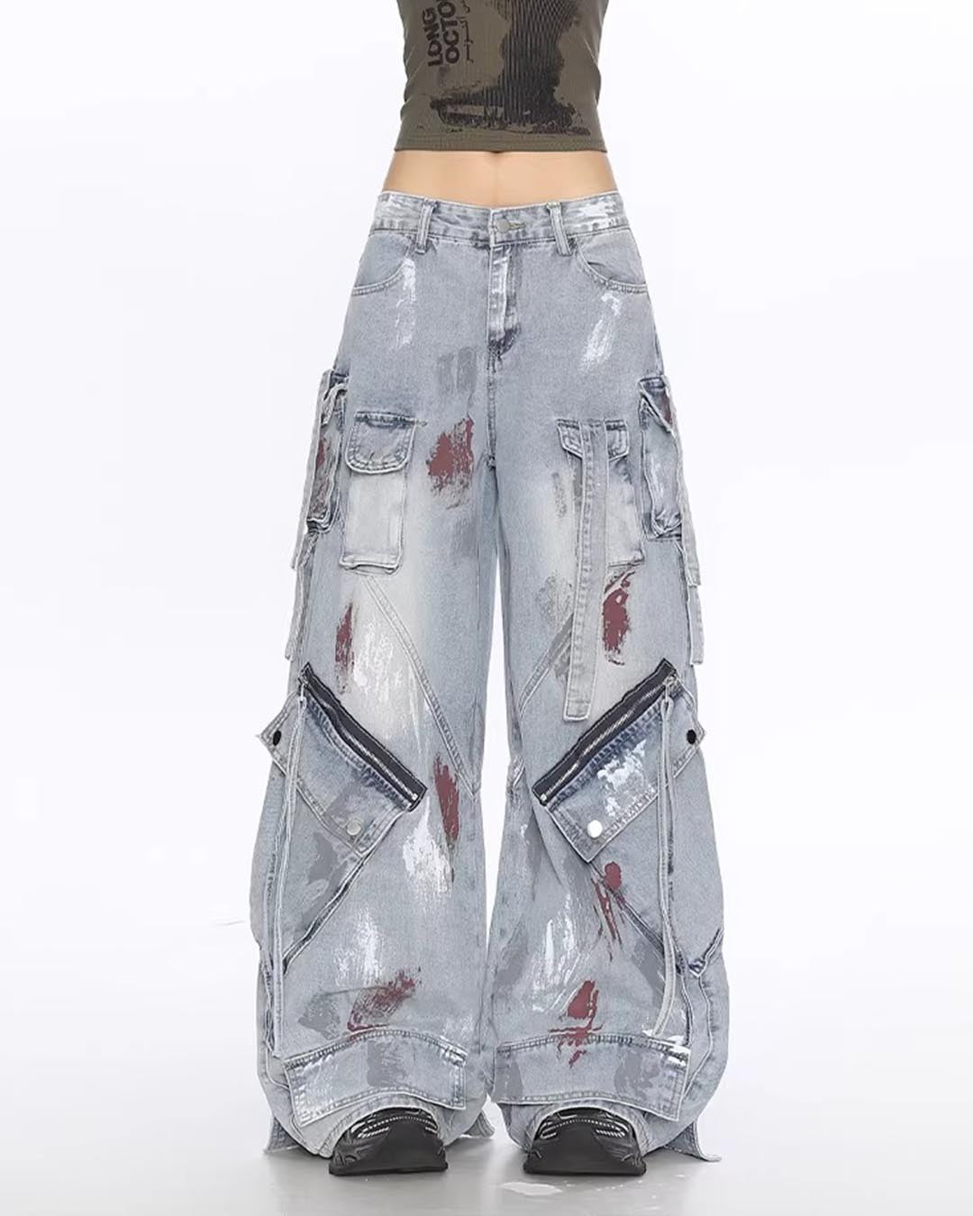 GRAFFITI UTILITY MULTI-POCKET DENIM PANTS - BLUE