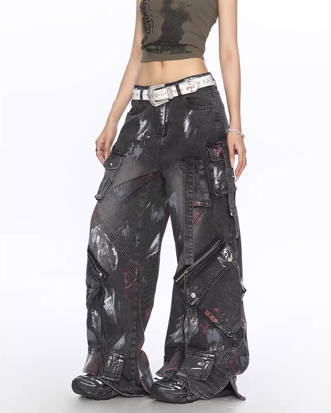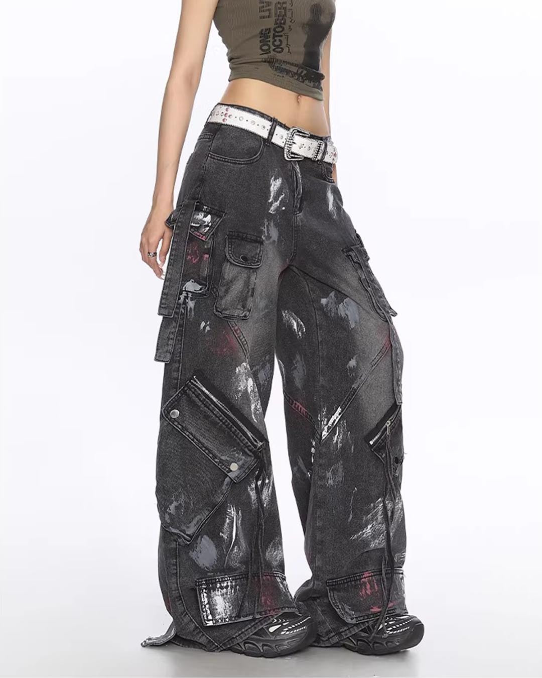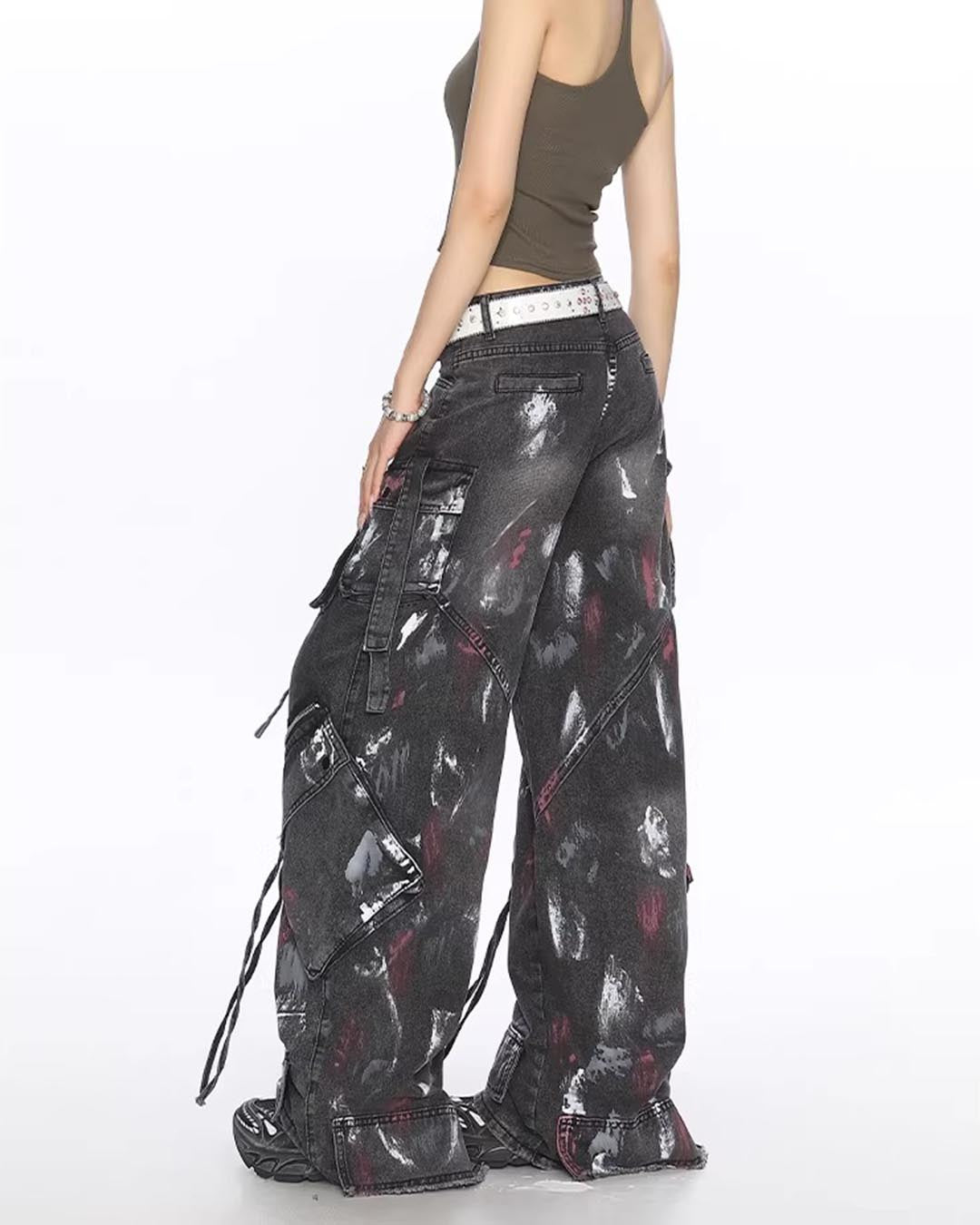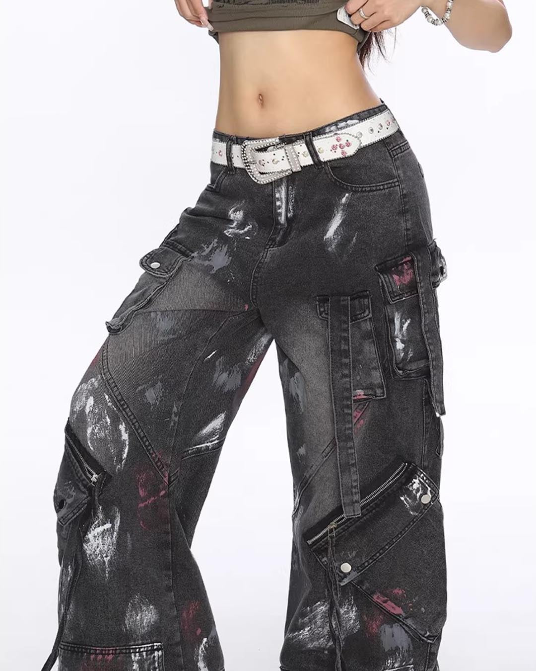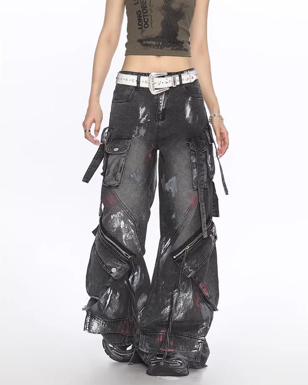 GRAFFITI UTILITY MULTI-POCKET DENIM PANTS - BLACK