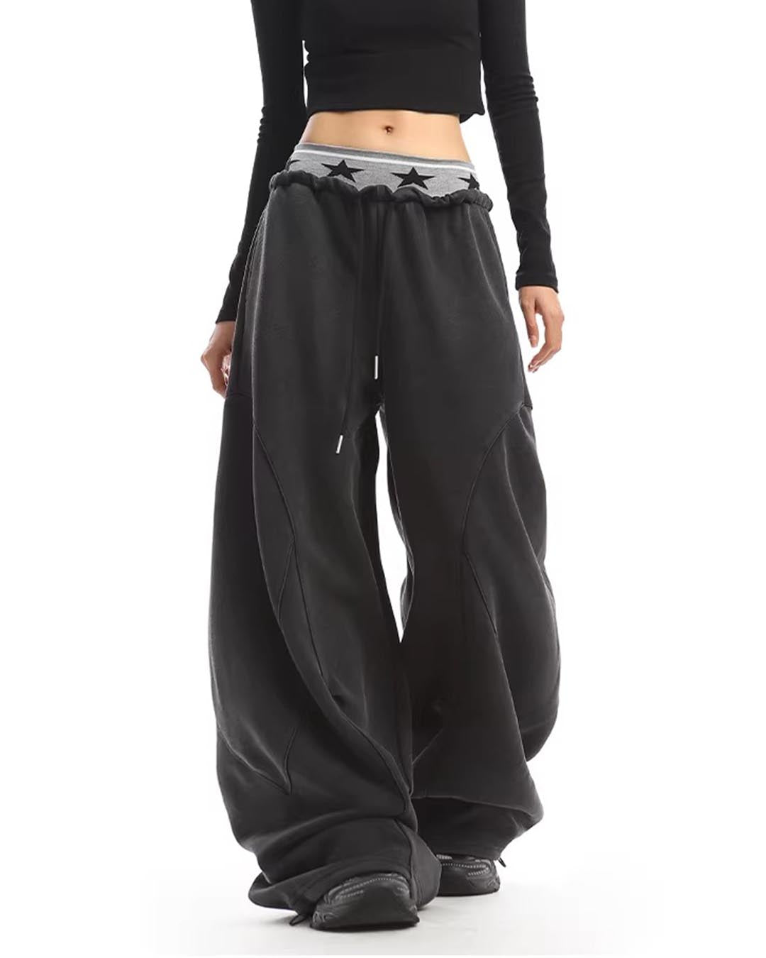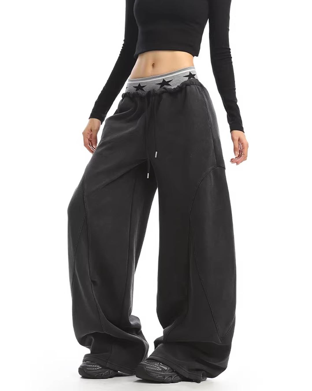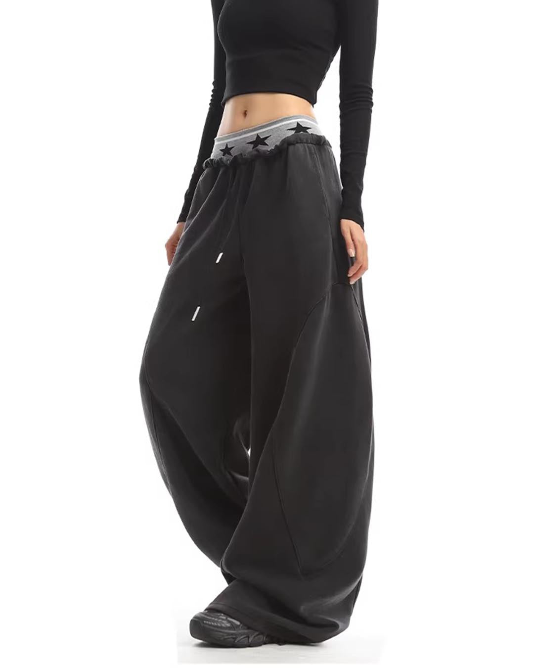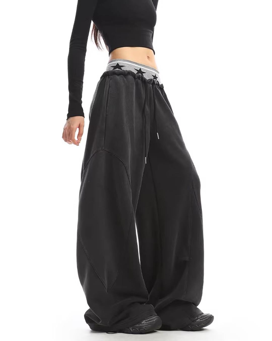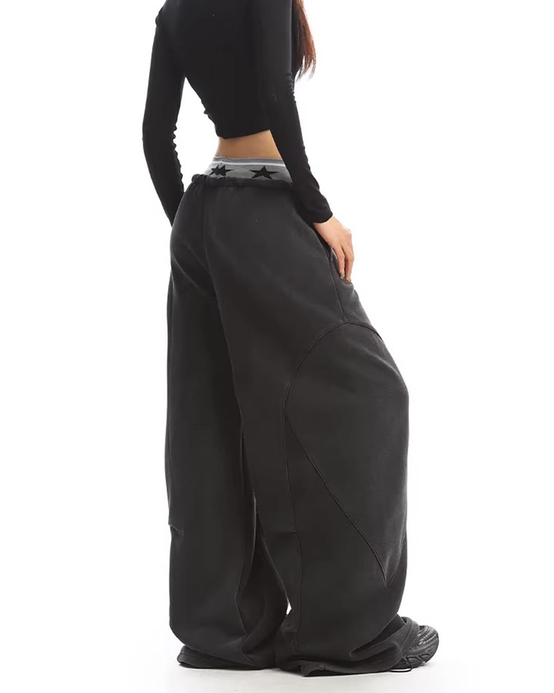 DOUBLE WAISTBAND WASHED WIDE-LEG SWEATPANTS - BLACK
