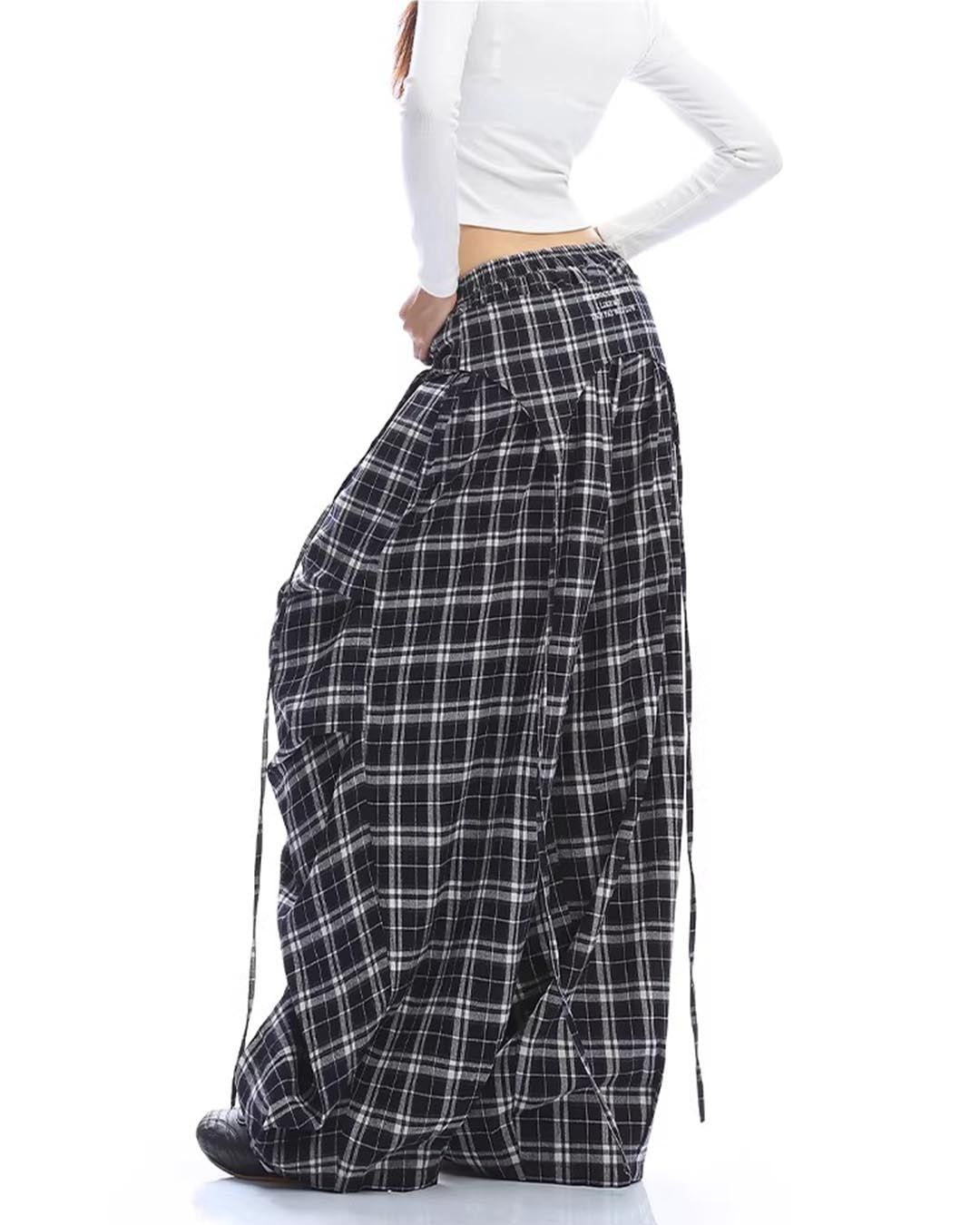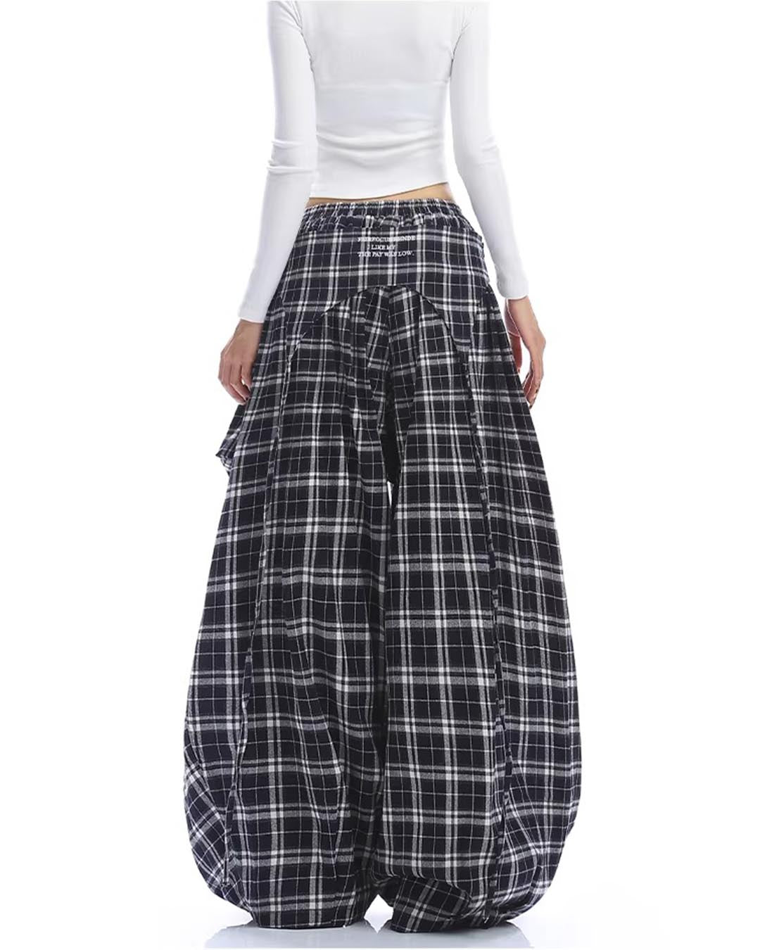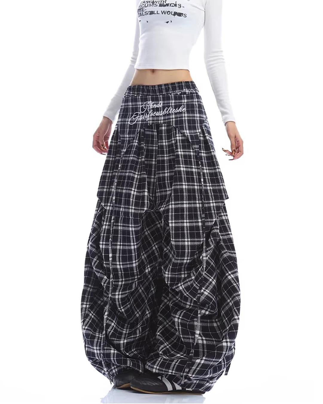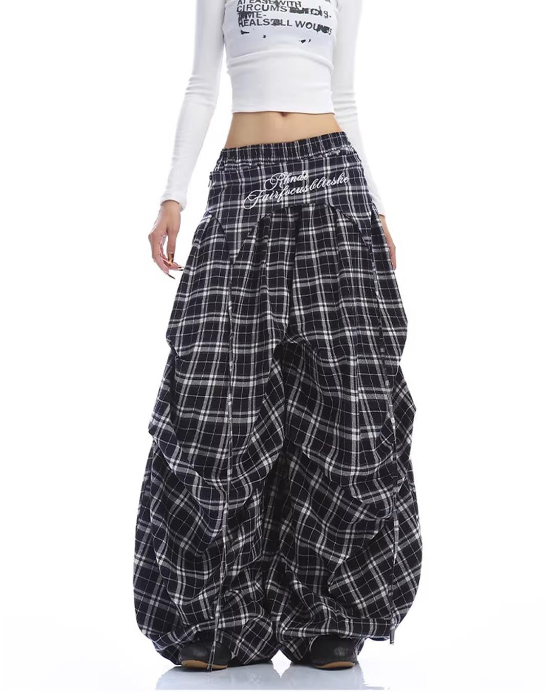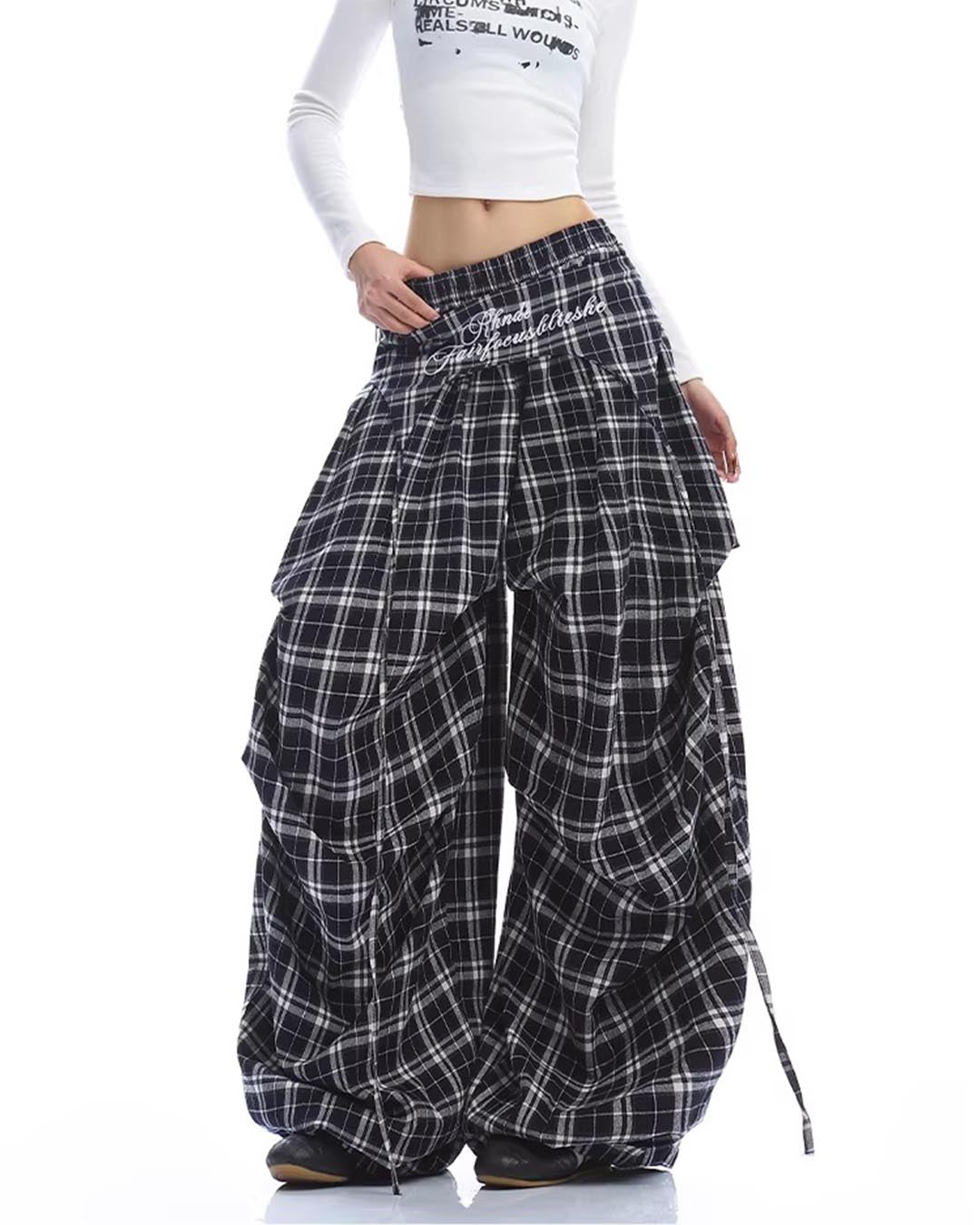 EMBROIDERED LETTER PLAID CURVED BARREL PANTS - NAVY